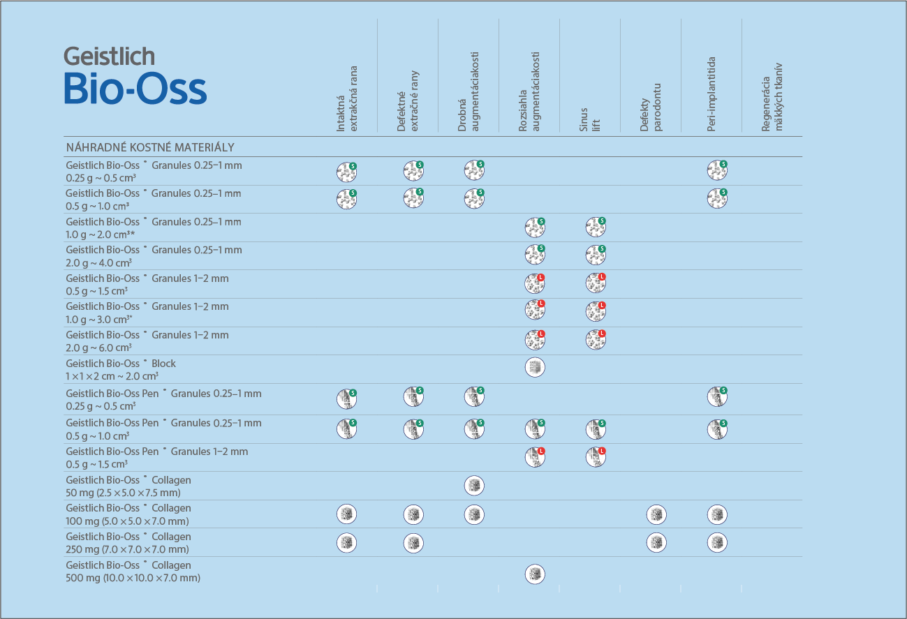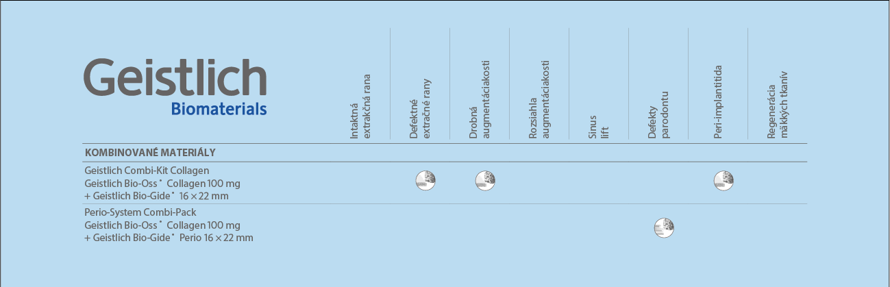 • Geistlich Bio-Oss® Collagen – kombináciu kostného materiálu a kolagénu pre jednoduchú aplikáciu,
