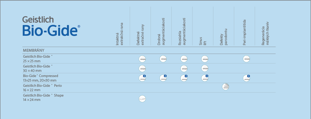 • Geistlich Bio-Gide® – kolagénové membrány pre riadenú kostnú a tkanivovú regeneráciu,